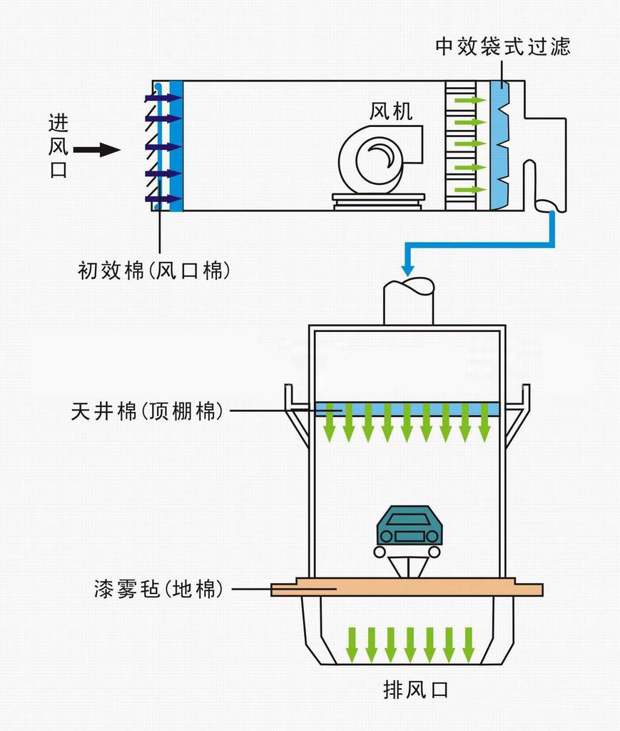 烤漆房空气过滤材料主要有风口棉、顶篷过滤棉和玻璃纤维棉(地棉)。风口棉用于烤漆房进风口处,作为初效预过滤使用;顶棚过滤棉用于顶部过滤,作为中效(高效)过滤;玻璃纤维棉用于烤漆房地沟,用于过滤喷漆烤漆中的漆雾。